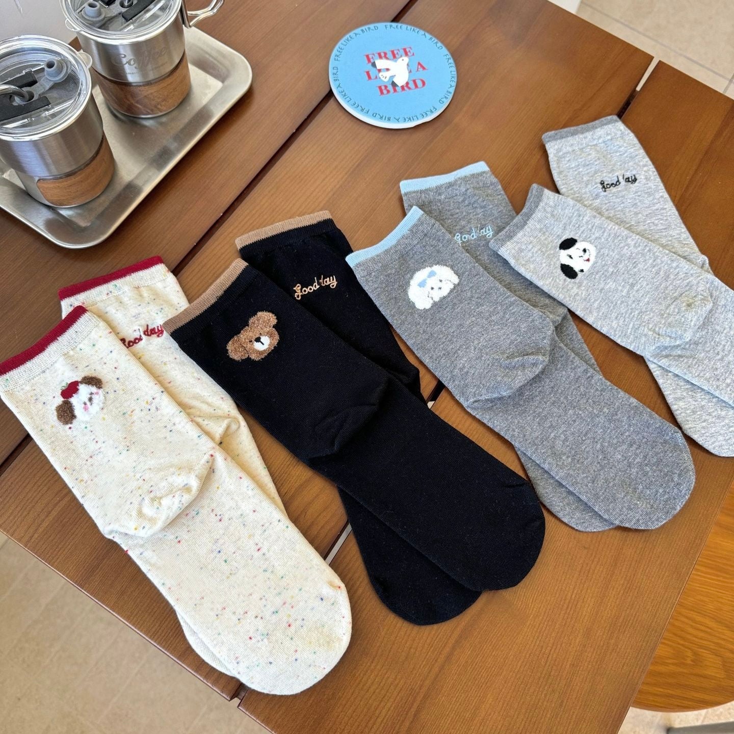 Soft, breathable crew socks featuring adorable embroidery—including a puppy wearing an apple hat, a fluffy bear, and playful pups. The off-white pair uses speckled yarn for subtle texture, and the neutral tones (speckled cream, black, gray) pair effortlessly with sneakers or loafers for a cozy, cheerful everyday look. ✨