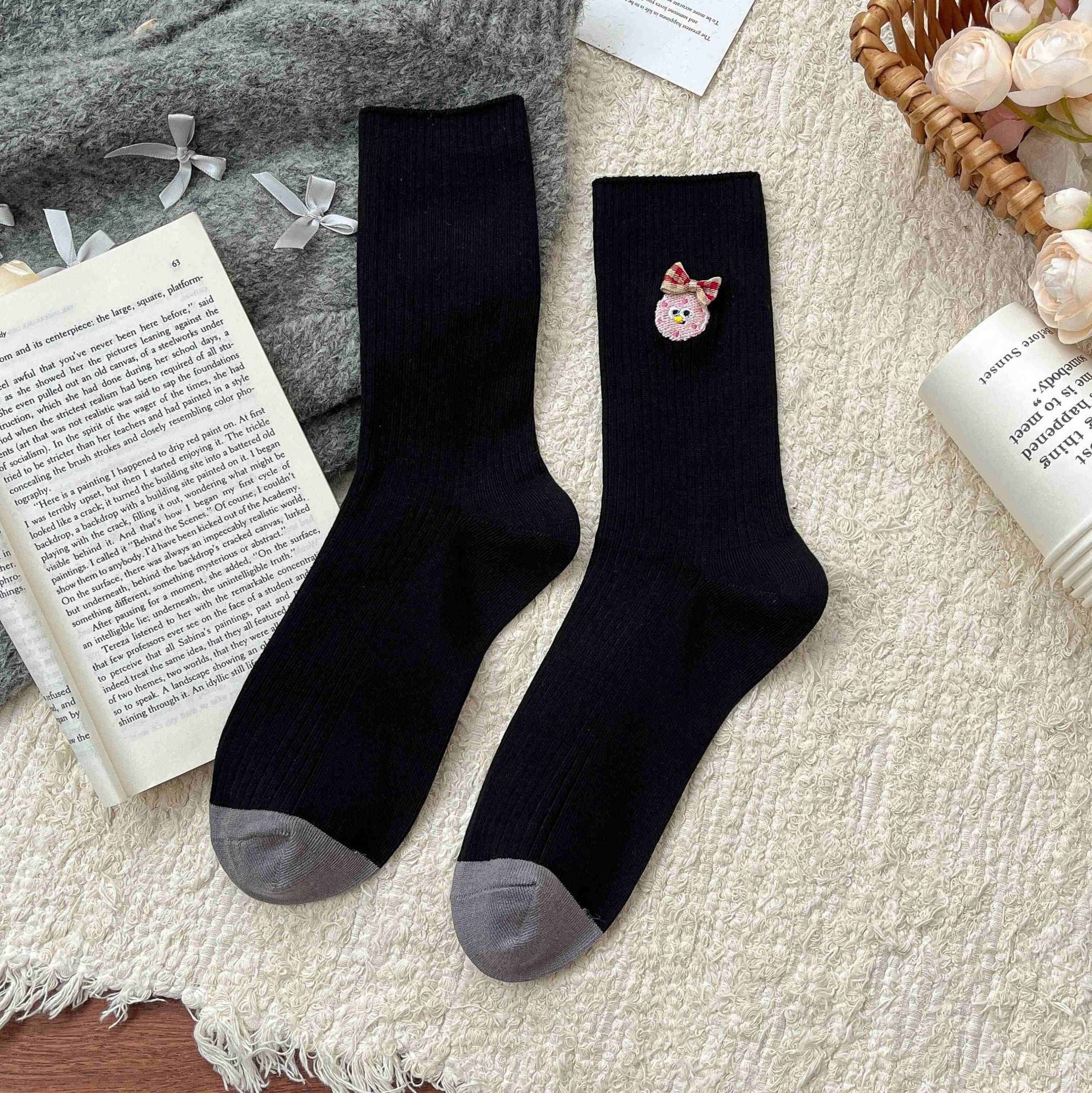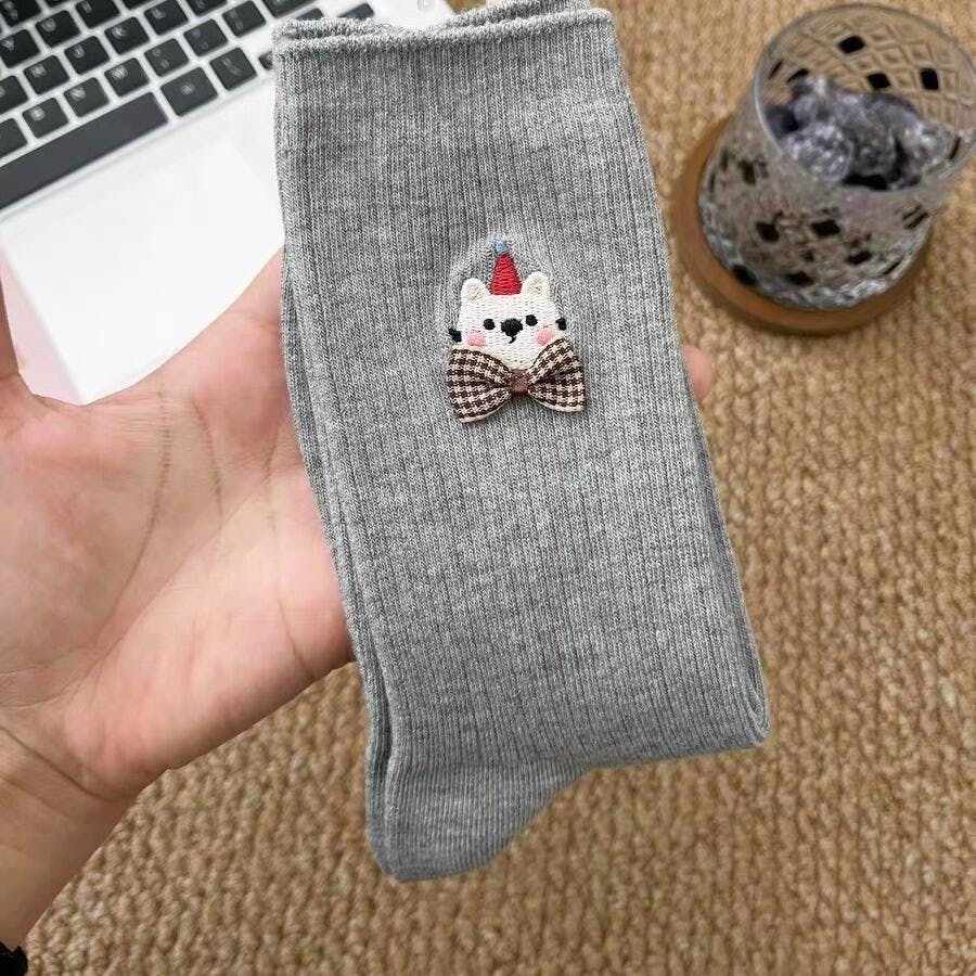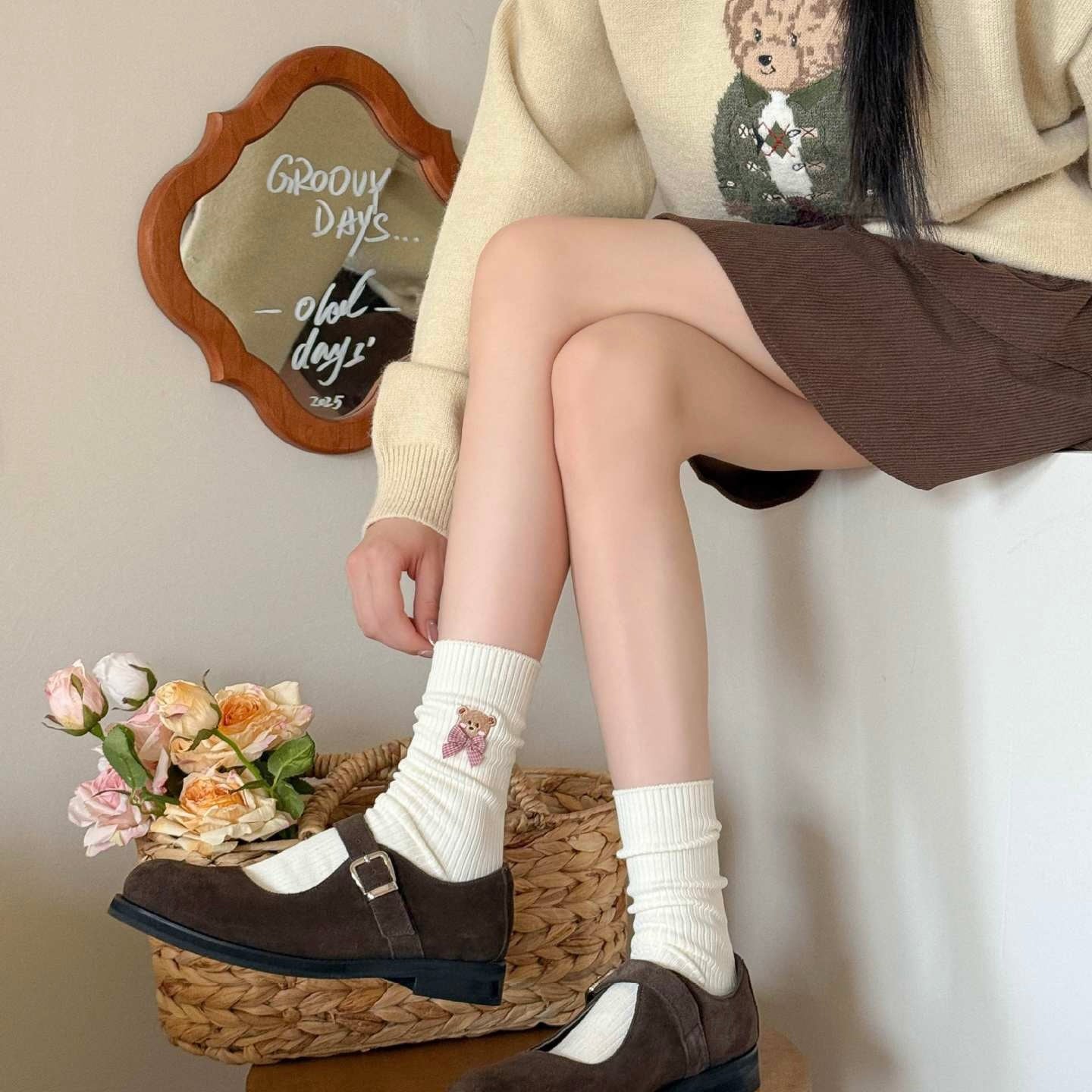 Soft ribbed cotton knit ensures all-day comfort. Adorable bear embroidery with pink bow adds sweet charm. Clean cream hue pairs seamlessly with sneakers and dresses. Crew length offers subtle coverage for casual looks.