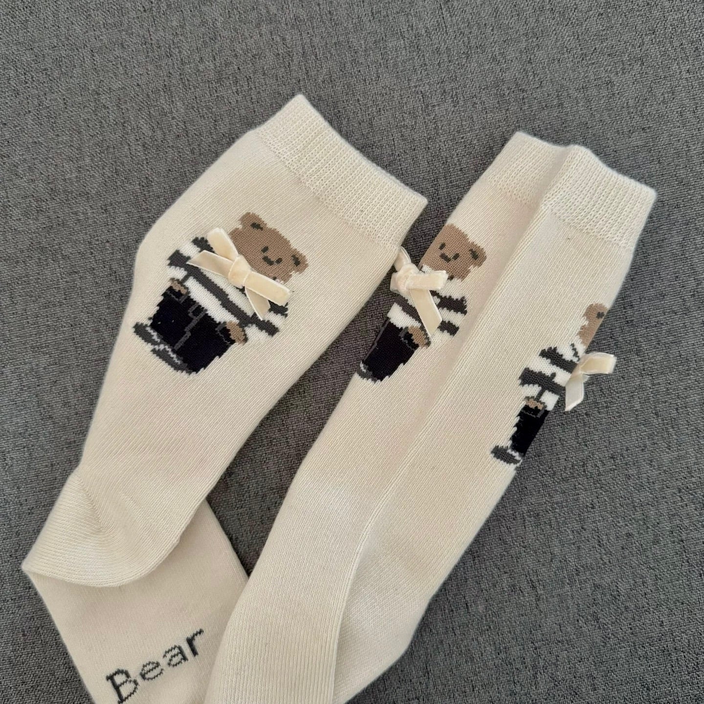 Style your steps with these elegant bear print socks. Made from soft breathable cotton, they feature a classic teddy bear design and a premium velvet bow accent. These durable crew socks are the perfect cozy accessory to elevate your loafers or boots.Heavyweight, for fall & winter / colder months