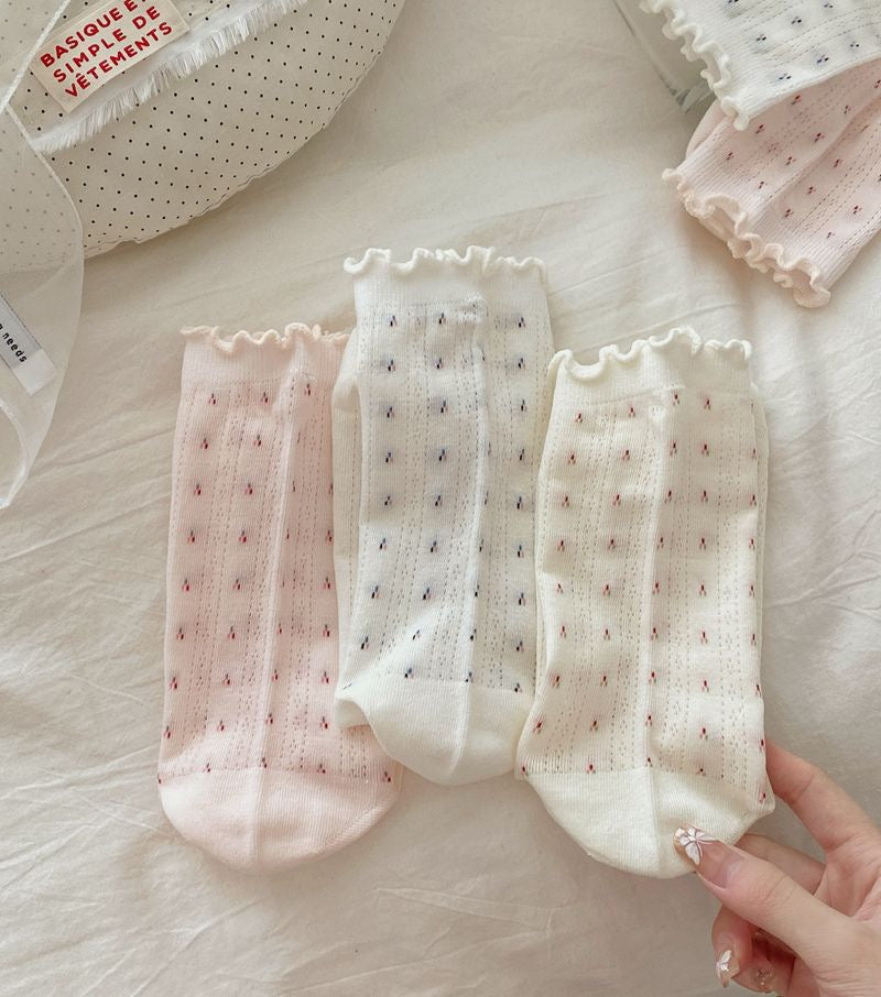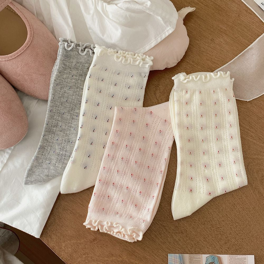 Lightweight and breathable, these ditsy-dot socks feature frilly ruffled cuffs for a sweet, feminine touch. The mesh knit keeps feet cool all summer long, perfect for pairing with ballet flats or sandals. Ideal for brunch, shopping trips, or lazy days in—add a soft, girly vibe to your warm-weather look. ✨
