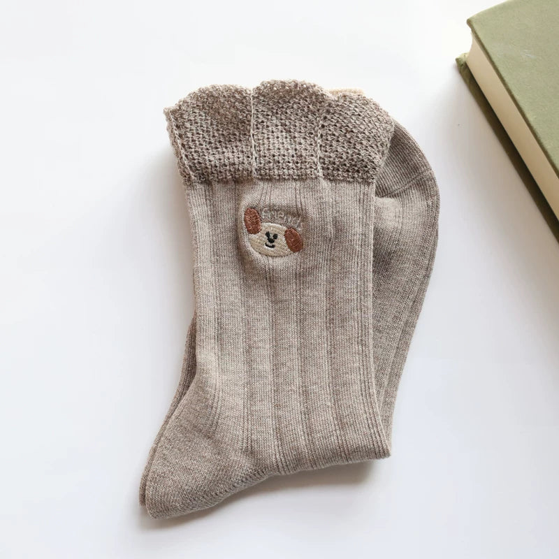 Enhance your daily wardrobe with these charming double-layer frill socks. Made from premium soft cotton with a classic ribbed texture, they feature a unique layered lace cuff and delicate animal embroidery. These breathable and stylish crew socks provide a comfortable fit and a refined feminine touch to any footwear.