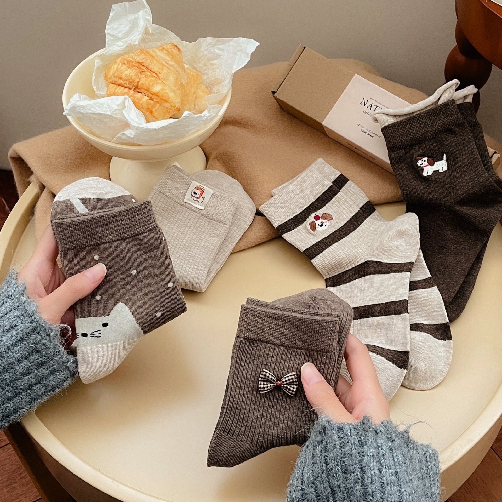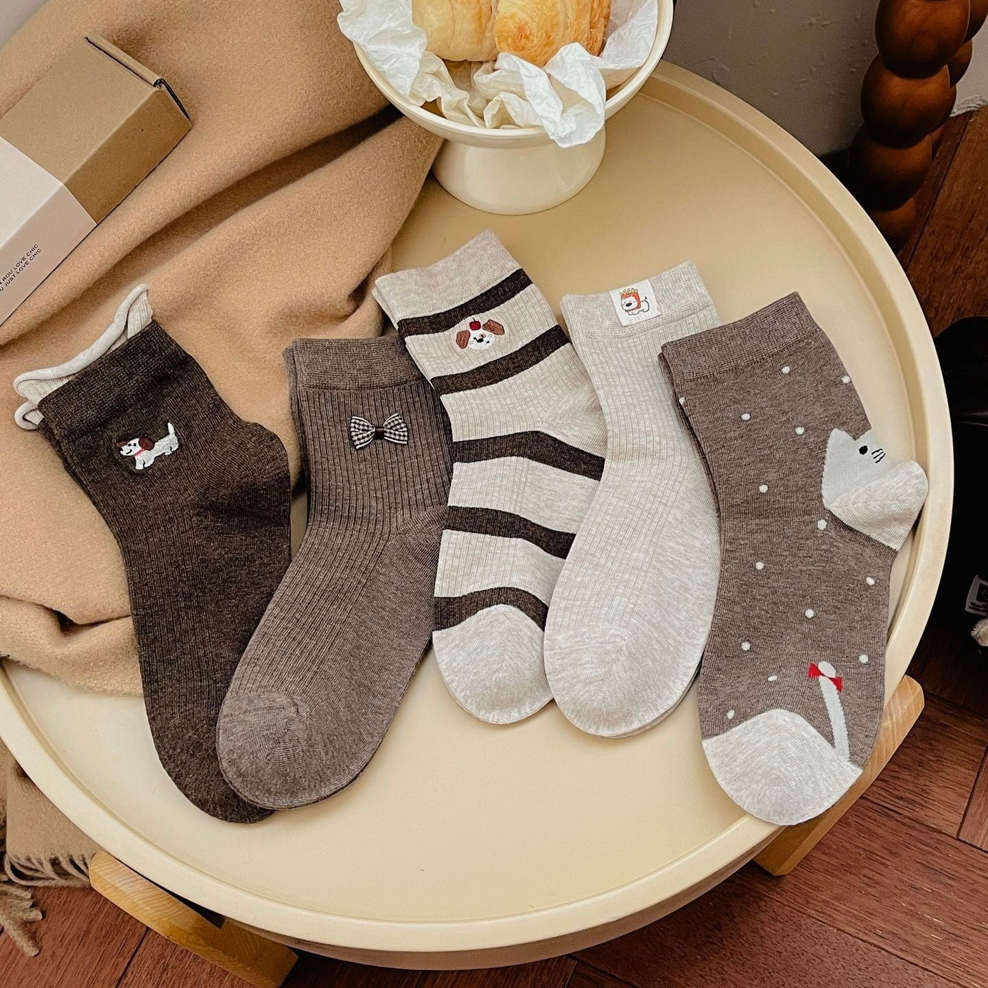 Soft, cozy cotton crew socks in warm coffee and gray tones, featuring cute animal embroidery (dogs, cats) and playful details like bows, stripes, and polka dots. Versatile enough for sneakers or loafers—add a subtle, charming touch to your everyday look.