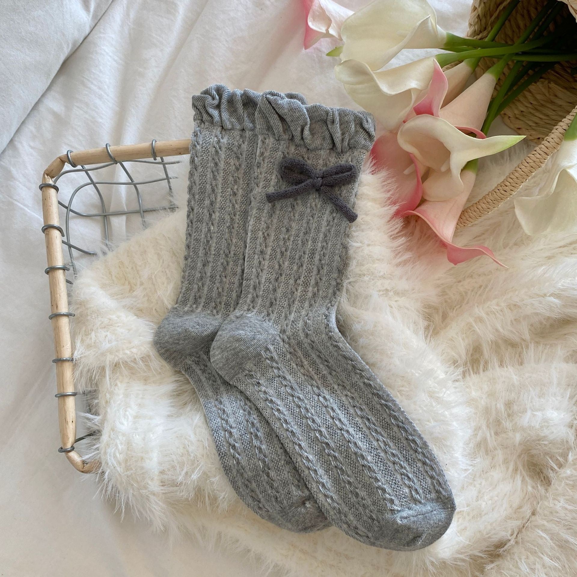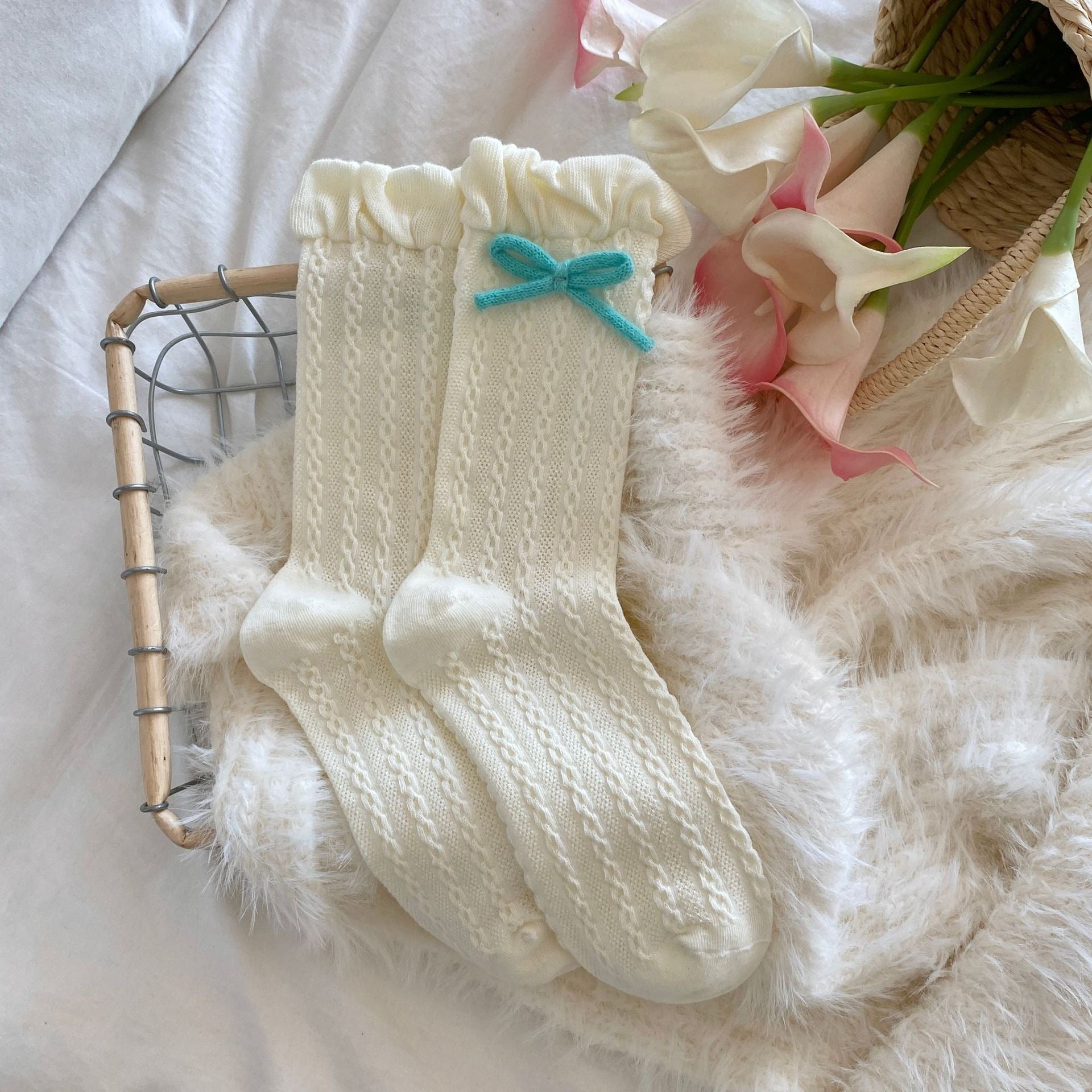 Soft, textured crew socks with delicate bow accents and ruffled cuffs. The breathable knit keeps feet cozy, and the dreamy pastel tones pair perfectly with sneakers or Mary Janes for a sweet, feminine look. ✨