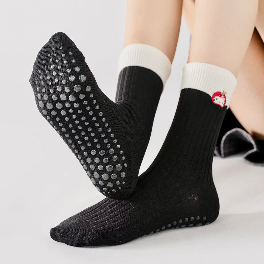These sports socks feature dense non-slip gel particles on the sole, enhancing grip for activities like yoga or indoor training. Made of soft knit fabric for a snug fit, they’re accented with a color-blocked cuff and Hello Kitty embroidery—blending sports functionality with cute styling, suitable for both exercise and daily wear.
