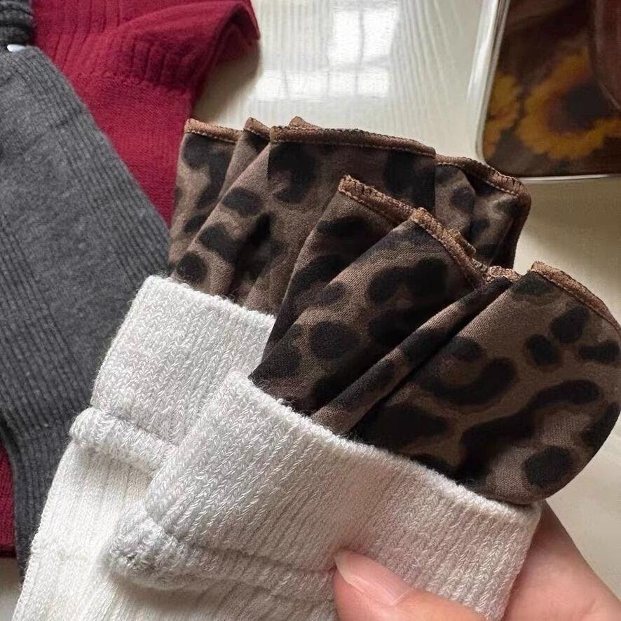 Premium cotton fabric offers soft, breathable comfort. Trendy leopard print ruffle cuff adds bold fashion flair. Ribbed texture ensures a snug, non-slip fit all day. Solid color body with leopard print accent for stylish contrast.