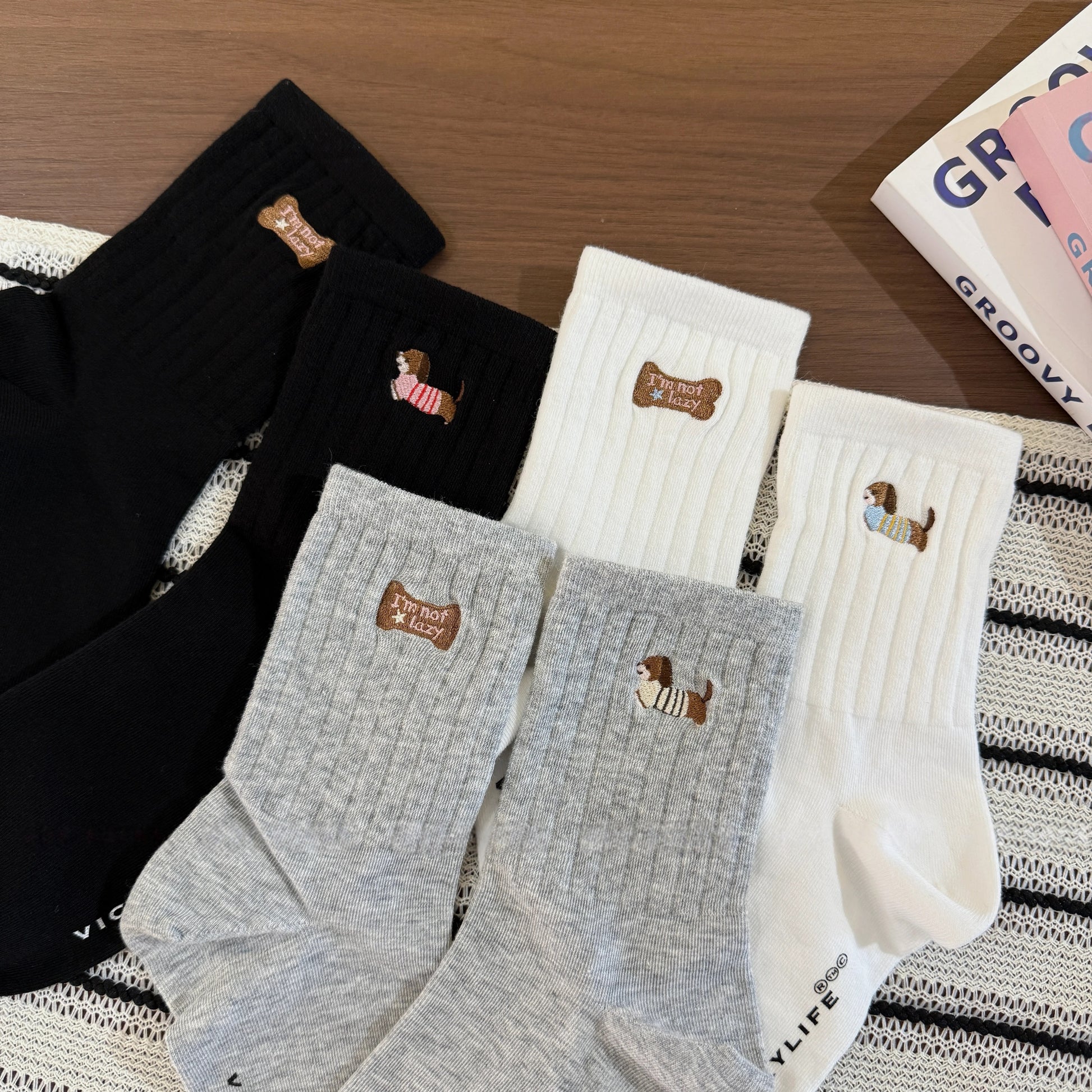 Feature a charming dachshund embroidery and a playful bone-shaped patch for a touch of personality. Crafted from premium, breathable fabric with a flexible stay-up cuff, they offer a flattering fit and all-day comfort for any casual aesthetic.