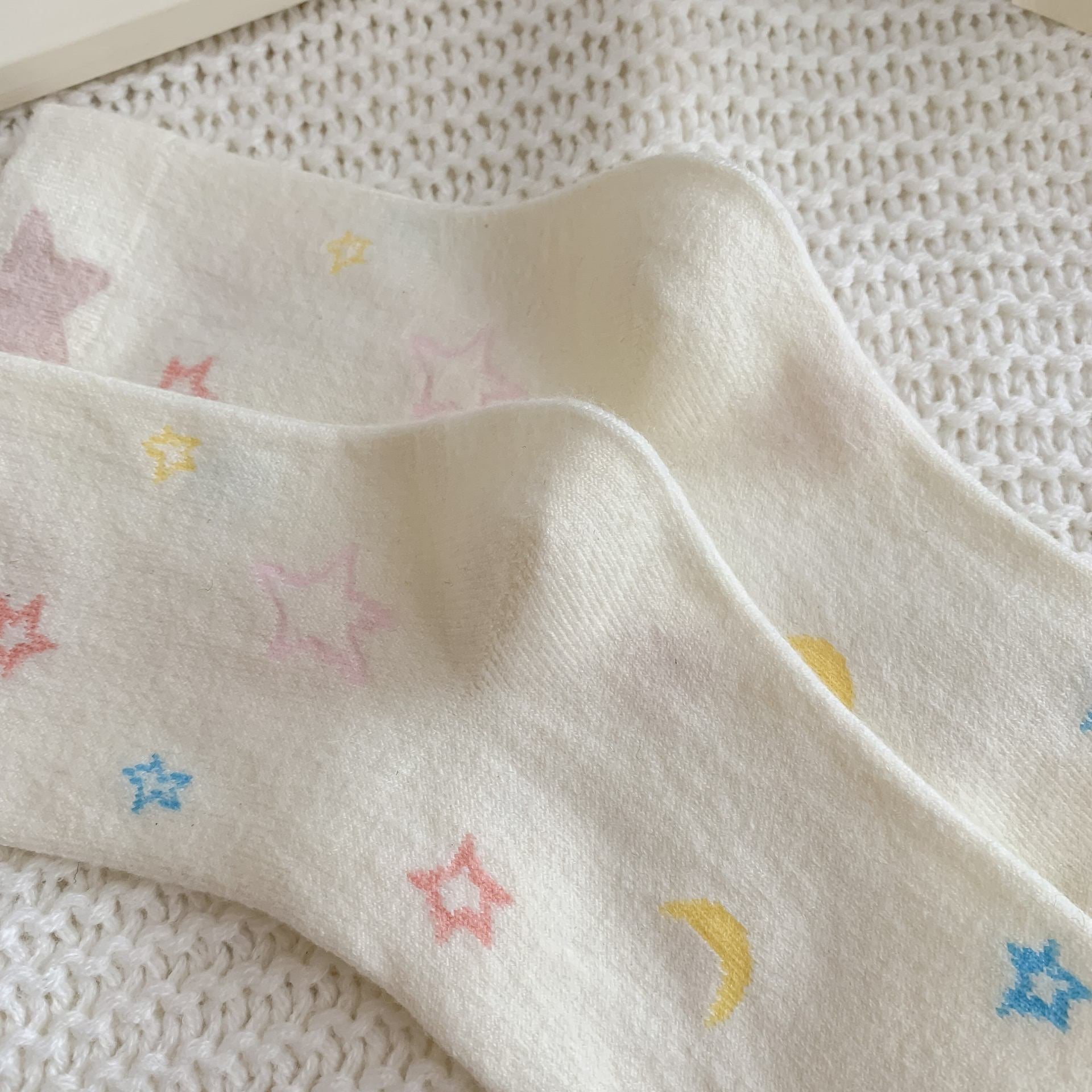 Soft, cozy crew socks in dreamy pastel pink tones, featuring fluffy bear embroidery, star and moon prints, and delicate stripes. The sweet, whimsical design pairs perfectly with sneakers or Mary Janes for a charming, everyday look. ✨